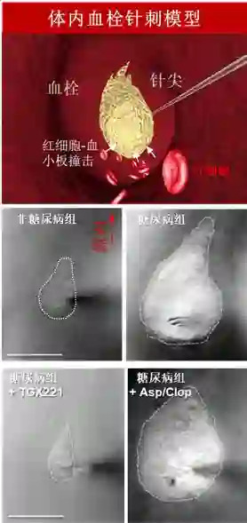 · 通过开展小鼠体内血栓模型实验,证实了糖尿病会引起尚未活化的血小板在血管中的聚合,其过程所倚赖的是一种生物力学机制。正常治疗剂量的阿司匹林、氯吡格雷均不能对这种生物力学机制产生抑制作用,但是如果抑制磷脂酰肌醇3-激酶则可以对其产生有效的阻断(图1)。