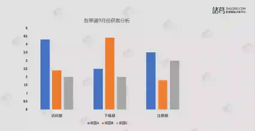 上面这张柱状图是针对9月份各渠道获客统计的一个对比分析图表,针对各渠道的下载量、访问量、注册量进行对比。