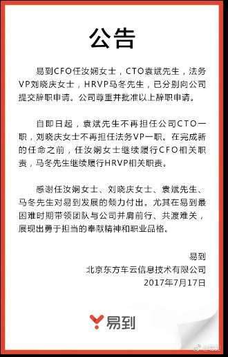 易到今日发布公告称,易到CFO任汝娴、CTO袁斌、法务VP刘晓庆、HRVP马冬,已分别向公司提交辞职申请。易到已经批准以上离职申请。袁斌、刘晓庆、马东三位高管都是在今年4月周航等原易到创始成员集体辞职后由乐视派驻任职易到。