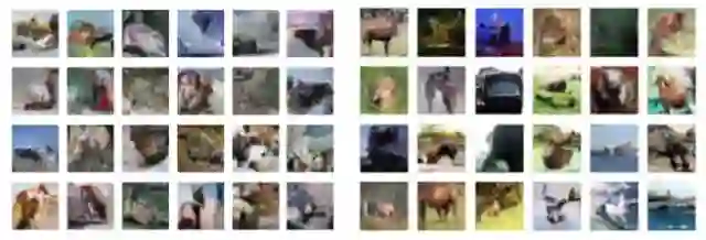 图 4:学习转换算子的方法的 CIFAR 样本。1000 步后的非平衡热力学(Sohl-Dickstein et al., 2015)(左),20 步后的 GibbsNet(右)。