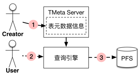 借助上文中我们对Alluxio的改造,打通了PFS和Pingo的账号认证系统。参考下图我们就可以实现这一权限代理机制。建表时,TMeta Server中就保存表T1的创建者信息。当进行查询时,查询引擎中先完成用户对表T1的访问鉴权。鉴权通过后,查询引擎就能获得表T1对应的PFS路径和创建者信息以及认证信息,然后在PFS中其实认证的是T1的创建者。这样只要用户有表的访问权限就可以读取表的数据了。