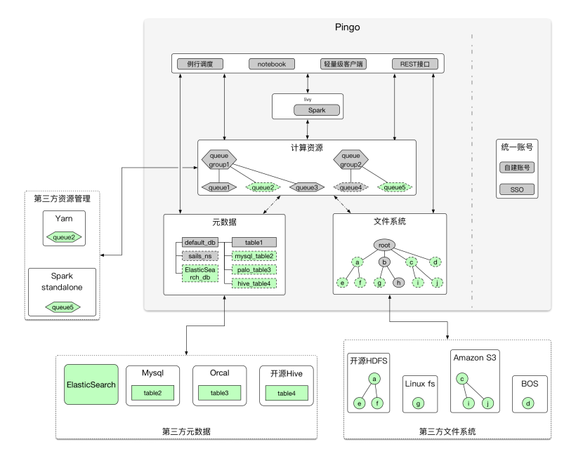 Pingo是来自百度的离线大数据集成开发平台,使用Spark作为计算引擎,深度整合了资源调度、文件系统、元数据管理、工作流管理、交互式Notebook查询等功能。能够对异地、异构的非结构化数据、结构化数据、计算资源进行统一接入、访问和鉴权,能够对各类企业级数据存储&计算环境进行统一管理。目前Pingo在百度内部、百度公有云、百度私有云三个场景同时提供服务。下面我们先分别介绍Alluxio和Pingo,然后从基于Alluxio的文件管理模块PFS的角度讲一些具体实现。