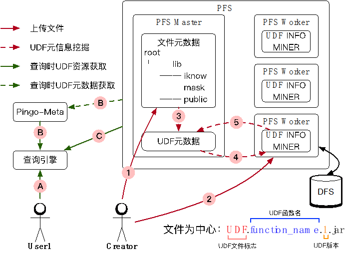 我们基于PFS实现了一个基于文件的UDF管理方案。如下图,UDF的创建者只需要把jar上传到PFS的指定目录,PFS-Worker(也就是Alluxio-Worker)就会自动提取出jar中的UDF信息并汇报给Master,并且还可以根据文件名自动记录不同的UDF版本。用户在执行SQL时根本不需要注册UDF,直接写函数名即可,当然也可以指定版本号。
