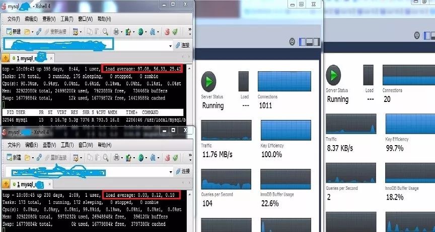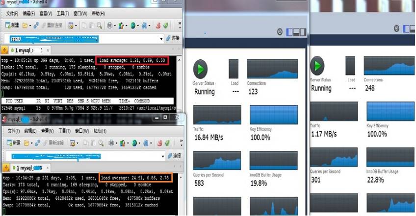 然后继续观察数据库服务器,使用 top 命令和 MySQL Workbench 查看 MySQL 主库和从库的各项负载吓一跳(如下图),MySQL 服务器主库的各项指标均已经达到峰值,而从库几乎没有太大压力。