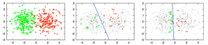 在请专家标记数据的时候会面临如下的问题:采用什么样的采样策略而得到行之有效的小部分待标注数据。比如在中图,线性分类器在一小部分随机采样数据上得到的决策边界是次优的,因为这条线明显偏离红色数据点并进入绿色形状区域,这是因为标记数据点选择不当造成的。在最右边图中,使用另外一种采样策略方法选择的一小部分数据点具有更好的决策边界,因为它更好地分离了两种颜色。