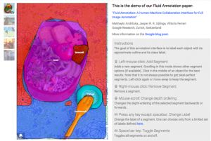 对图像分类标注的模型预训练可以采用语义分割模型(Mask R-CNN)预先生成约1000个图像片段及其分类标签和置信度分数,即Google 的流体标注(Fluid Annotation)。置信度分数最高的片段用于对标签的初始化,呈现给标注者。然后,标注者可以: