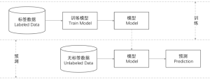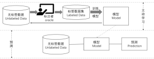 为了更好的理解主动学习的流程,首先先回顾一下监督学习流程。监督学习分为训练(train)和预测(Prediction)两个阶段,在训练阶段通过标签数据集来确认模型的参数,得到一个模型。在预测阶段将无标签的数据输入到已经训练好的模型,得到一个预测的标签。