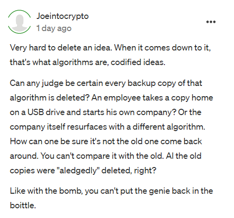也有人指出,这个命令执行起来是很困难的。因为你很难知道对方有没有真的将算法删除。「万一有个员工用 U 盘将算法拷回家,回头重新开个公司怎么办」。