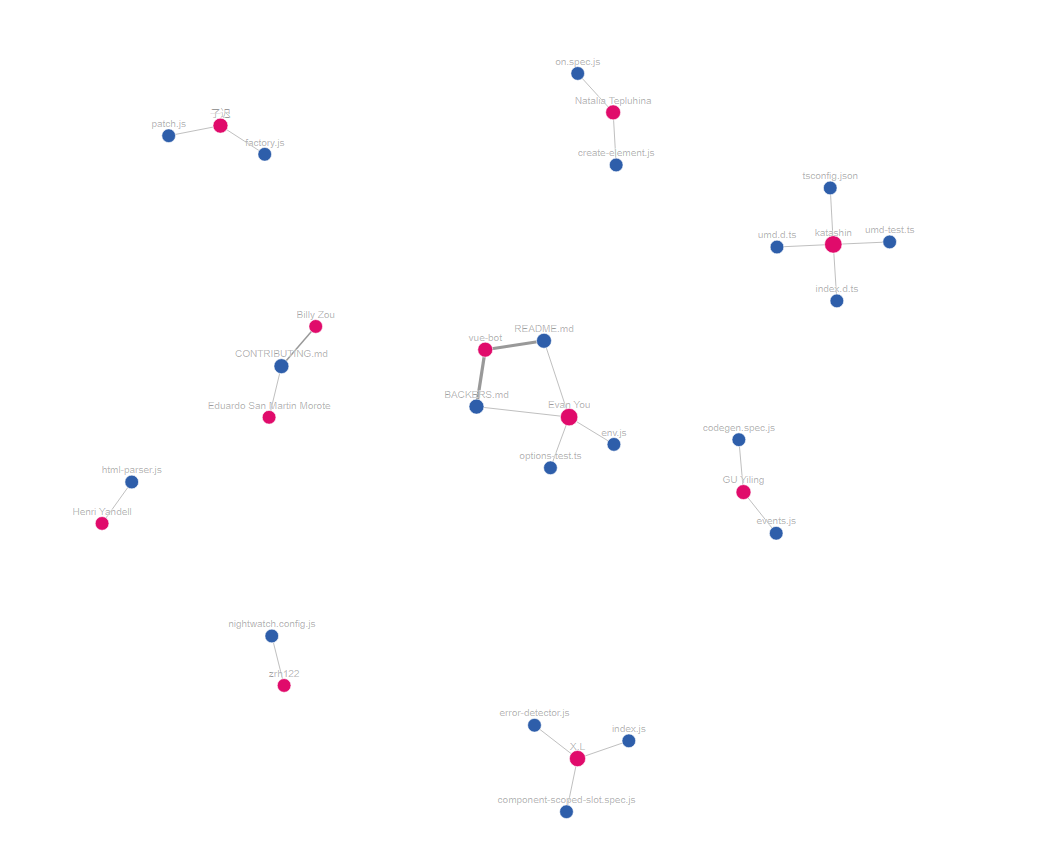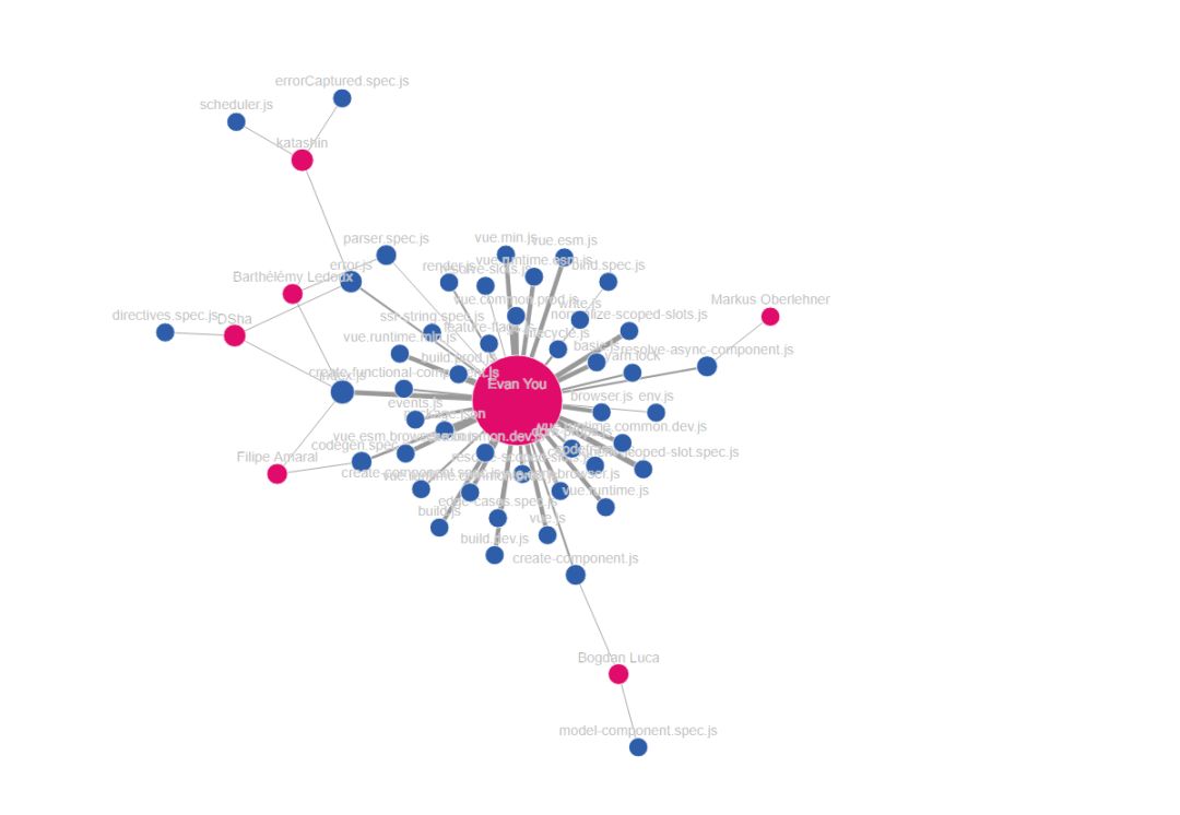 Vuejs/Vue 大部分贡献都是由一个账号 Evan You 尤雨溪做出的,该项目 4 月份之后内容贡献图呈现出许多协作孤岛的形态,反映出贡献者对少量文件的修改,项目变动不大。