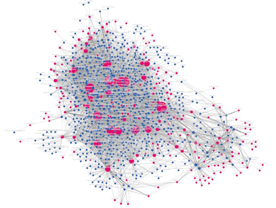 针对排名前 20 的中国开源项目,我们对仓库的历史 commits 记录进行挖掘,并做了可视化展示(蓝色节点代表仓库文件,红色节点代表用户)。Git 仓库中的每一个 commit 记录由贡献者产生,对仓库的一个或者多个文件产生影响,因此对特定时段内的所有贡献者的提交记录分析能反映出贡献者的活跃程度、协作模式以及项目社区本身的类型属性。