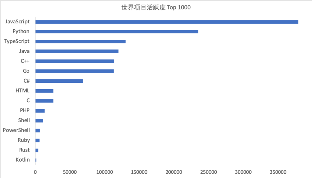 我们分别对世界项目活跃度 Top 1000 的项目、世界项目参与人数 Top 1000 的项目和中国开源项目统计了不同开发语言的项目数量以及使用不同开发语言进行 PushEvent 操作的开发者的数量,二者相乘估计使用不同开发语言的开发者的数量,可以发现 JavaScript 使用最多。