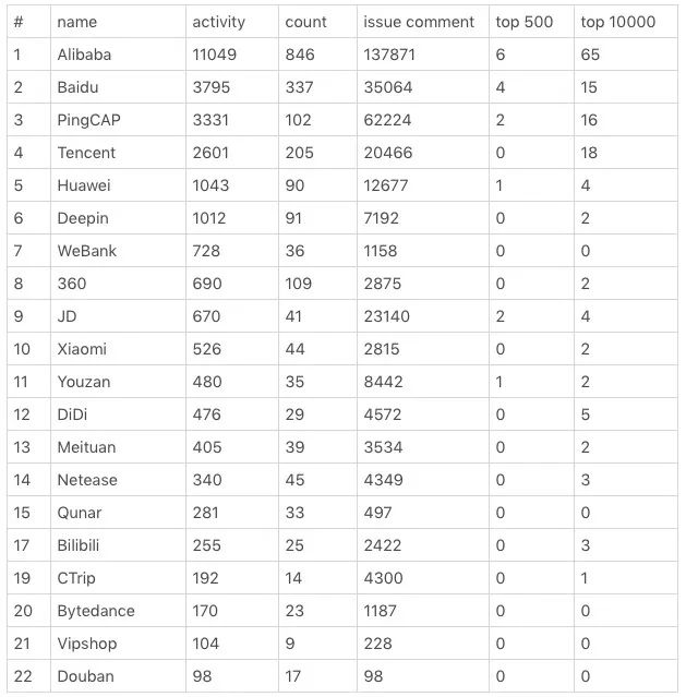 在国内企业的开源数据中,我们可以看到阿里的数据几乎在所有类别里都名列第一,有时甚至是其它公司之和,并且在社区化 / 开放等方面也做得不错。但放到全球角度,出自阿里的知名度相对较高的项目,还是 Apache Dubbo,以及在 2019 年收购而来的大数据流处理框架 Flink。2019 年 9 月在杭州的云栖大会上,阿里宣布贾扬清正式担任阿里巴巴开源技术委员会负责人,开源将明确升级为阿里技术战略之一。