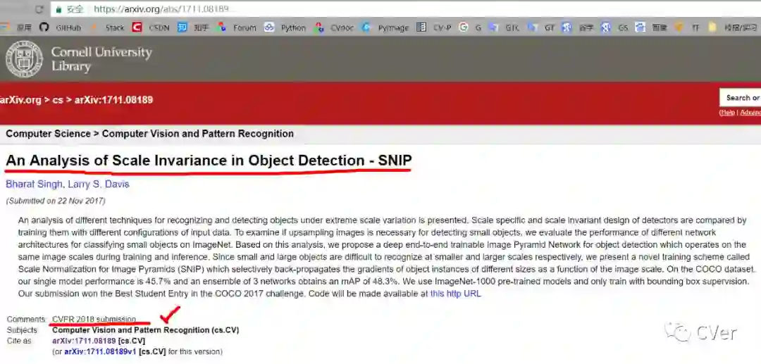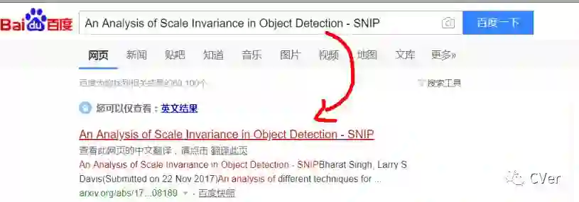 然后将需要阅读的论文标题复制到 google/baidu 搜索框中,比如《An Analysis of Scale Invariance in Object Detection - SNIP》