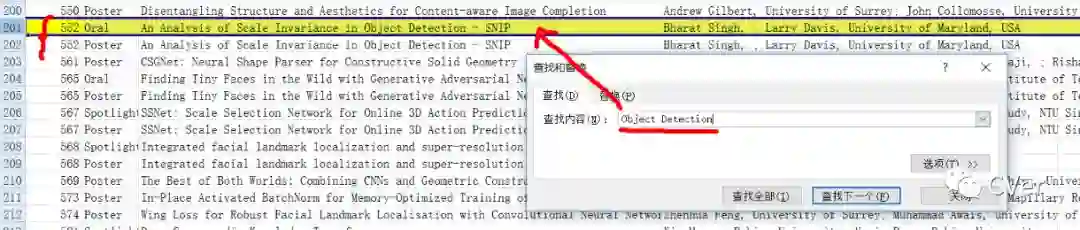 打开 cvpr2018-paper-list.csv,按下 crtl + F,输入要查找的内容,如 Object Detection,然后你就可以看到一篇篇关于 Object Detection 的论文啦!