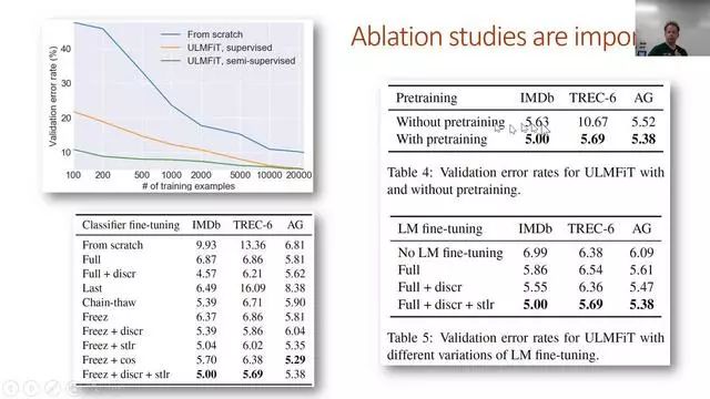 迁移学习在计算机视觉领域做出了许多革命性的成果,但是直到现在却没有在NLP领域有重要的应用(在某种程度上可以说是被忽略了)。在这节课上,我们会展示如何预训练一个全语言的模型,能超越此前基于简单词向量的方法。我们将把这一语言模型看作是文本分类的最新成果。