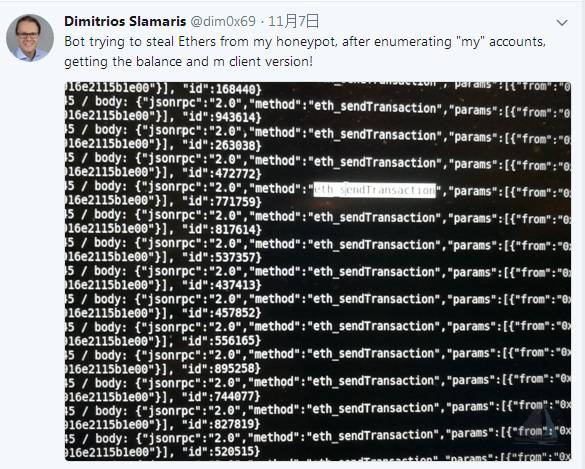 安全研究人员Dimitrios Slamaris最近也发现,有人在本地公开的Ethereum节点向JSON-RPC接口发出网络请求,命令系统转移钱包里的以太币。Slamaris本月初监控到的一起作案中,黑客成功地转移了8个以太币(约价值3200美元)。Slamaris还发现了大量扫描以太币钱包的2个IP地址: