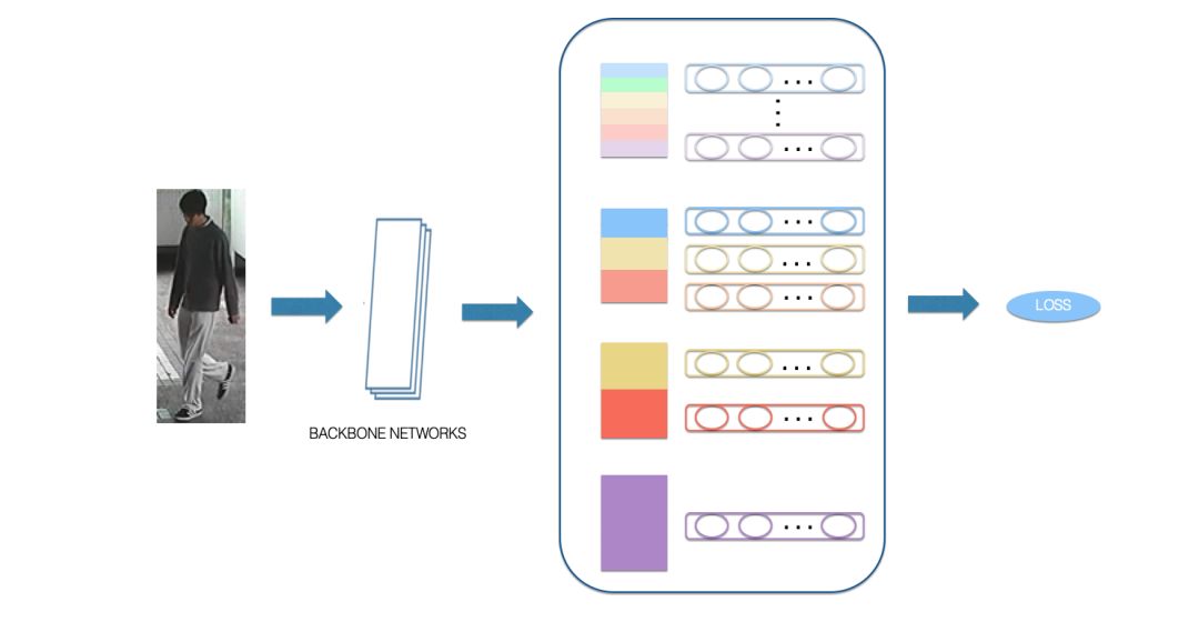 基于局部特征的方法,也存在一些问题,这一类方法将行人划分为各个独立的语义分块,并没有考虑各个局部特征之间的关联,因此,在我们的方案中,我们使用到了多级局部特征的融合方案,在考虑各个局部特征的同时考虑多个局部特征的关联关系,具体网络结构如下图所示,在原始的局部特征的基础之上增加了多个不同尺度的局部特征以及全局特征,学到的特征不仅能够表示各个部位的细节特征,还能表达不同部位融合在一起的特征,相较原始版本更加丰富化。