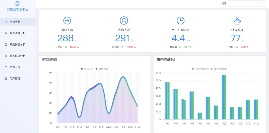 目前我们客流数字化的数据已经沉淀到相应的产品,以下是基础客流的示意图,品牌商可以看到门店每日的基础客流量以及分时段的客流情况,了解各个门店当前的经营状况。