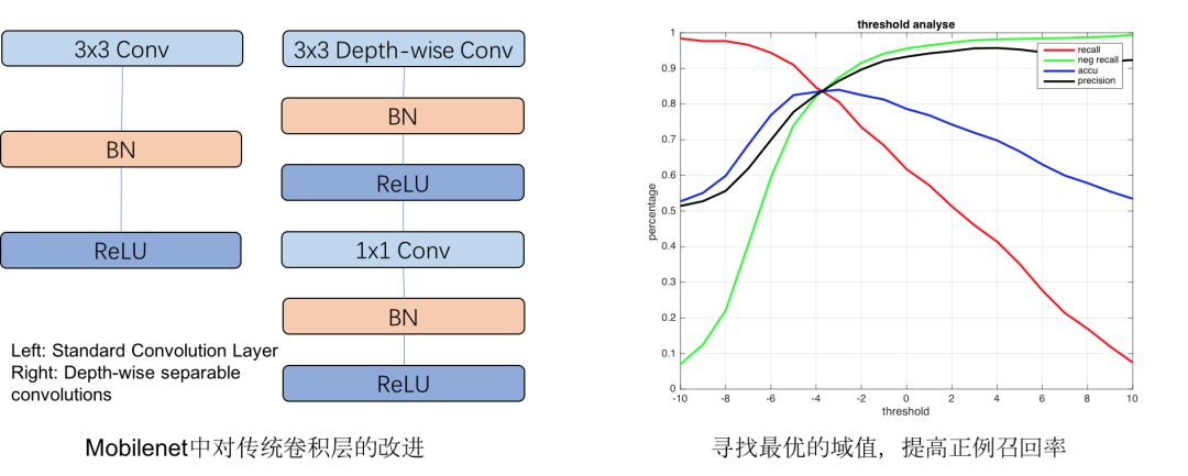 基于图像的顾客动作检测是经典的分类问题,为了减小对计算能力的需求,我们使用了:MobileNet[12]对行人检测的图像进一步分类,并根据模型Logits输出进行了最优化参数寻优,在保持分类精度时,提高正例召回率,确保正例尽可能被召回,如下图所示。