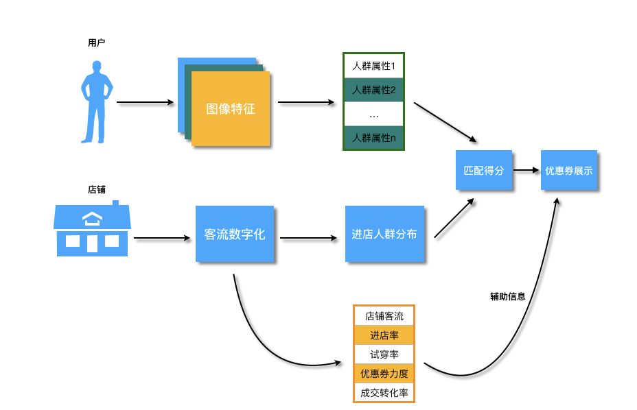 整体方案依赖三部分的数据,分别是基于用户的图像特征产出的人群属性数据,以及各个店铺的进店人群分布数据和店铺的其他统计量的特征,基于用户当前的属性特征与店铺的人群分布进行匹配,可以得到初步的个性化的店铺推荐结果,此外,使用店铺本身的统计量特征作为辅助信息,在同等匹配条件下额外考虑各个店铺本身的热度,效率等维度特征,以及当前所提供的优惠券的力度信息,得到最终的优惠券的排序,并展示给用户。