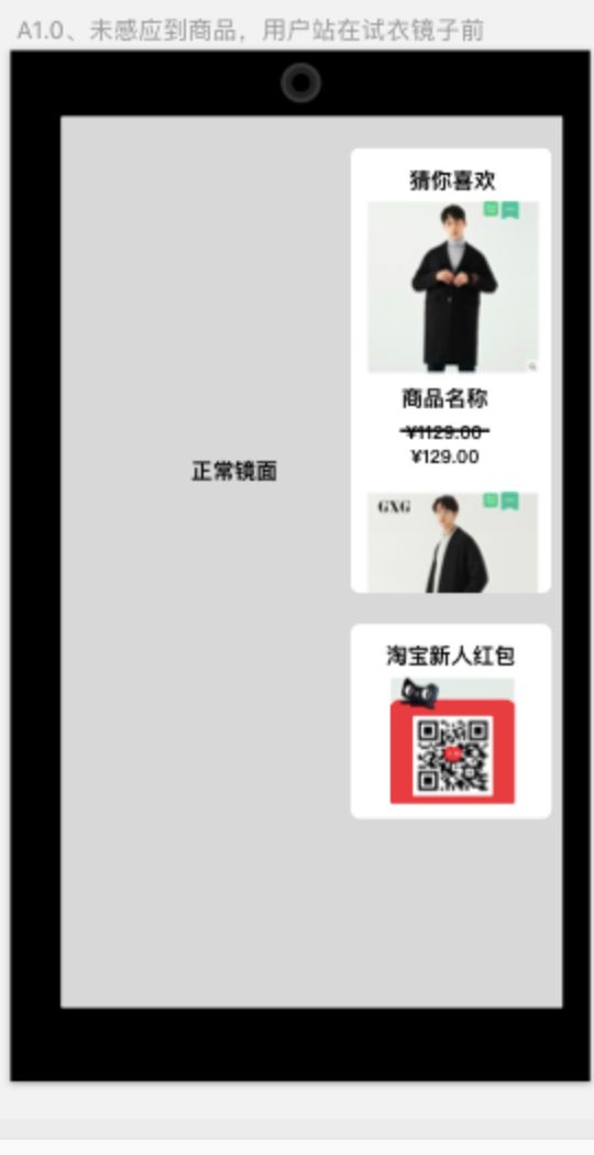 在用户进行试穿时,会在镜子侧方显示商品的详情信息,包括目前商品是否有折扣等,同时会基于用户的试穿行为,推荐相关商品与搭配商品,给部分商品一次额外的展示机会,同时也能够基于用户的试穿以及用户当前的图像特征给出个性化的推荐结果,方便用户的选购,即使用户暂时没有这个消费习惯,镜子屏幕上的推荐结果也能对导购员进行一些辅助决策,能够帮助导购员给用户推荐更加个性化更加丰富的商品。
