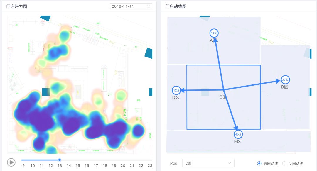 下图为区域热力图和区域动线图,区域热力图展示了门店在一天内各个小时各个区域的人流量密度情况,我们将各个不同摄像头的数据进行整合,最终映射到门店的平面CAD图上展示区域热力,让门店能够更直观的看到各个区域的热度,区域动线图展示了各个区域客流的去向和来源的占比,基于区域热力和动线数据,商家能够清晰的了解到门店各个区域的密度情况以及各个区域之间顾客的转移情况,目前合作的品牌商也会基于区域的数据对店内的陈列做适当的调整,甚至有门店基于动线的数据重新调整整个门店的区域分布情况。