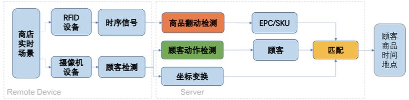 门店中装配有监控摄像机设备与RFID接收器器设备,分别录制实时视频与RFID标签受激反射的 时序信号,首先基于回传的RFID信号与检测哪些RFID标签可能被翻动了,由于店铺服务员已经将RFID标签的EPC编号与商品的 SKU编号关联入库,基于被翻动的标签EPC编号可以取到对应商品的SKU,同时,使用回传的顾客图片检测出疑似有在翻动商品的顾客,并根据顾客的图像坐标进行坐标变换,得到该顾客的真实物理坐标,最后,将检测出的疑似被翻动的商品与疑似有翻动商品动作的顾客进行关联,得到商品与行人的最佳匹配。