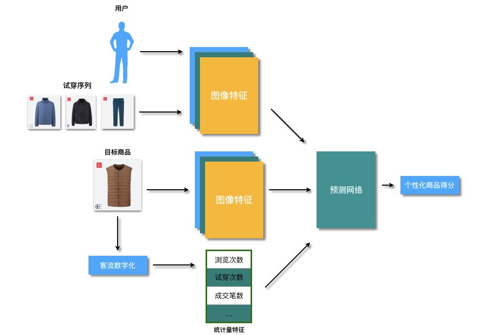 场内试衣屏的作用是做第二层的流量分发,即用户进店后,需要推荐哪些商品展示给用户。在传统的门店中,用户进店后会在店内进行随机的浏览,对于感兴趣的衣服会找导购员提供试穿,试穿后导购员也会对顾客进行推荐。整个过程中存在一些问题,首先,用户对于商品的浏览和商品摆放的位置关系很大,橱窗的商品会更容易吸引用户注意,而部分较密集的衣架区,用户可能没有办法注意到部分货品;其次,试穿之后导购进行的推荐也会因人而异,和导购本身的素质关系也较大,有些经验丰富的导购员可以根据你个人的长相气质推荐更适合你的商品,而更多的导购员只能简单的基于当前的热销款来进行推荐,无法做到因人而异。