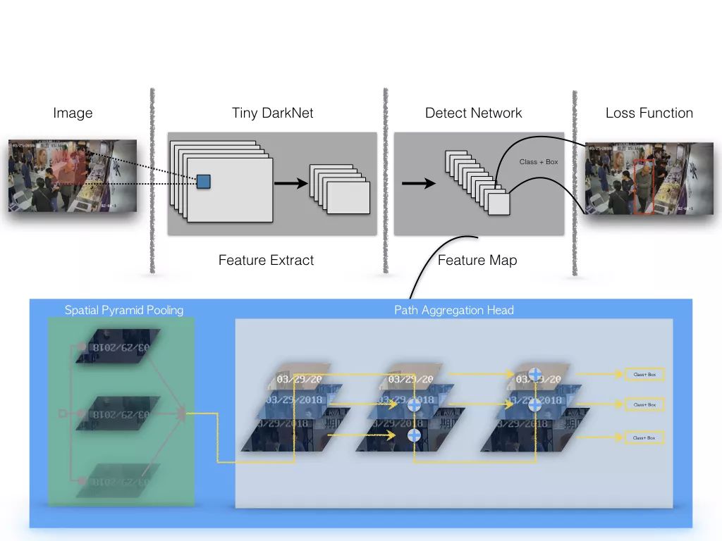 标准YOLOv3的网络结构有106层,模型大小有237M,为了设计一个轻量级的目标检测系统,我们使用Tiny DarkNet来作为骨干网络,Tiny DarkNet是一个极简的网络结构,最大通道数为512,模型大小仅4M,该模型结构比YOLO官方的YOLOv3-Tiny的骨干网络还要精简,但精简网络会造成特征抽取能力的衰减,模型性能下降剧烈,在我们人工标注的2万多张服饰门店场景数据集上,替换后的Tiny DarkNet + FPN结构较原生结构的AP-50(IOU=0.5)下降30%。我们在特征抽取网络之后进行Spatial Pyramid Pooling[10],与原特征一起聚合,之后通过下采样与反卷积操作将不同层级特征合并,希望将底层的像素特征和高层的语义特征进行更充分的融合来弥补特征抽取能力的下降,整体网络结构如下图所示,精简后的检测模型大小约为原来的1/10。