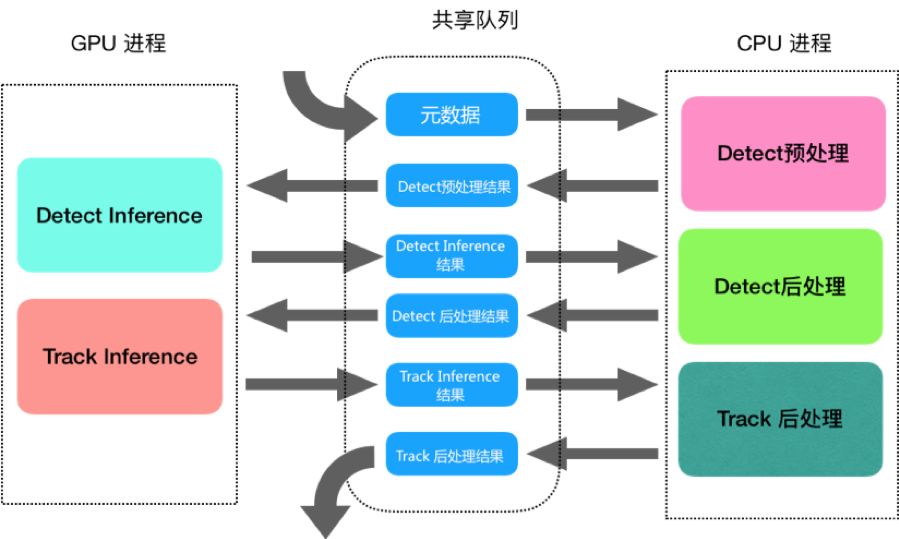 通过观察测试数据,我们惊讶地发现,虽然程序已经处于视频流图片处理饱和的状态,但是6核心CPU的使用率才到150%,GPU的使用率才到30%,也就是说,超过一半的硬件资源处于闲置状态。 为了使得原本间歇性闲置的资源得到重新的利用,我们改造成了流水线模式,结构图如下所示: