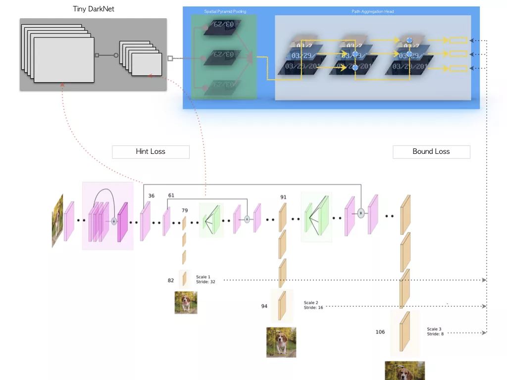 上图是我们网络蒸馏的模型结构设计,蒸馏时我们采用原生YOLOv3作为Teacher Network,虽然YOLOv3拥有较好的检测性能,且结构上与我们的模型比较相似,但直接在二者输出层之间建立L2约束,无法克服Teacher Network中的噪声及回归预测的波动,结果反而抑制了Student Network的学习。实验中发现Hint Layer的损失设计和回归预测的不确定性是蒸馏效果的核心问题,强行在对应Channel之间建立损失约束的方式过于严苛。对于普通卷积而言,我们无需要求Teacher / Student Network的Input Channel顺序保持一致,仅需要整个输入的分布是一致的。每个Channel相当于一次采样结果,相同的分布,采出的样本顺序可能多种多样,但整体结果符合相同分布,同时经过激活函数的Channel分布不再稳定,需要进行归一处理。为了避免Teacher Network回归预测本身的不稳定,回归损失设计时仍以Ground Truth为目标,将Teacher Network的Output作为Bound,仅对误差大于Teacher Network的部分进行约束,本质上是在借Teacher Network来进行Online Hard Example Mining。