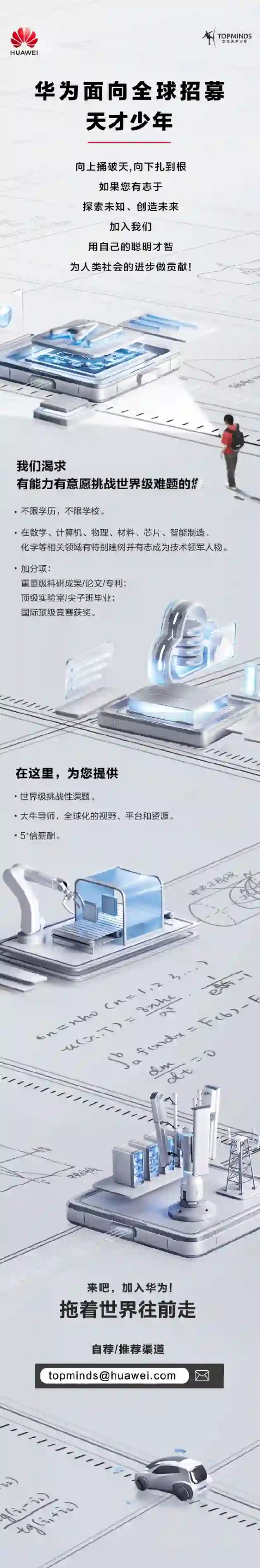 华为在本次招聘启示中表示,此次全球「天才少年」招募计划不限学历、不限学校。主要面向数学、计算机、物理、材料、芯片、智能制造、化学等相关领域。