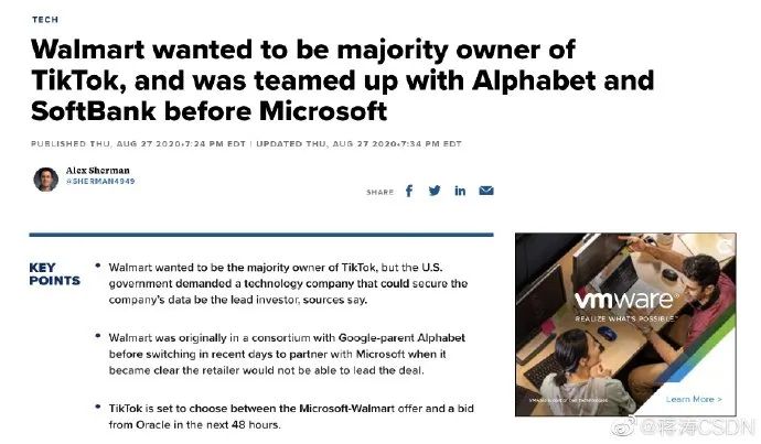 据知情人士,TikTok 接近达成一项协议,可能以 200亿 至 300 亿美元出售其在美国、加拿大、澳大利亚和新西兰的业务。交易可能会在下周宣布,买家仍未确定,TikTok 仍在与甲骨文和微软进行谈判。沃尔玛曾与软银合作竞标,但由于没有技术合作伙伴,因此不太可能为最终的买家。(新浪科技)
