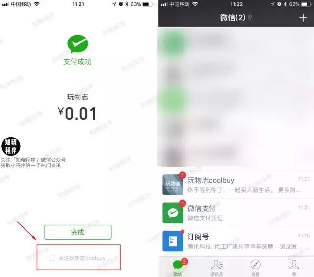 据悉,当用户在小程序支付成功后,在“完成”按钮下方,将有关注公众号的复选框(默认不选中),如果勾选关注选项,会收到微信支付的支付回执和服务号的关注回复。