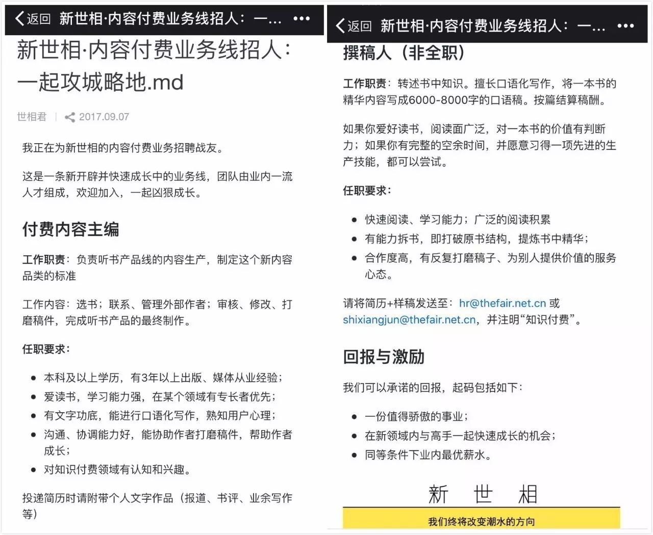 新榜讯 今天,“新世相”方面流出的一份招聘文案显示,它正在进军内容付费业务,招聘付费内容主编及兼职撰稿人(如图所示),将推出拆书、听书产品。