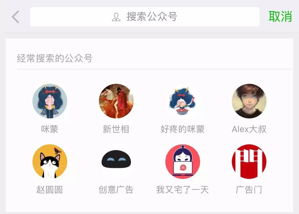 不仅如此,“公众号”一栏也出现8个经常搜索公众号列表,点击公众号头像可直接进入公众号,又一公众号展示窗口。(为了增强粘性也是操碎了心)
