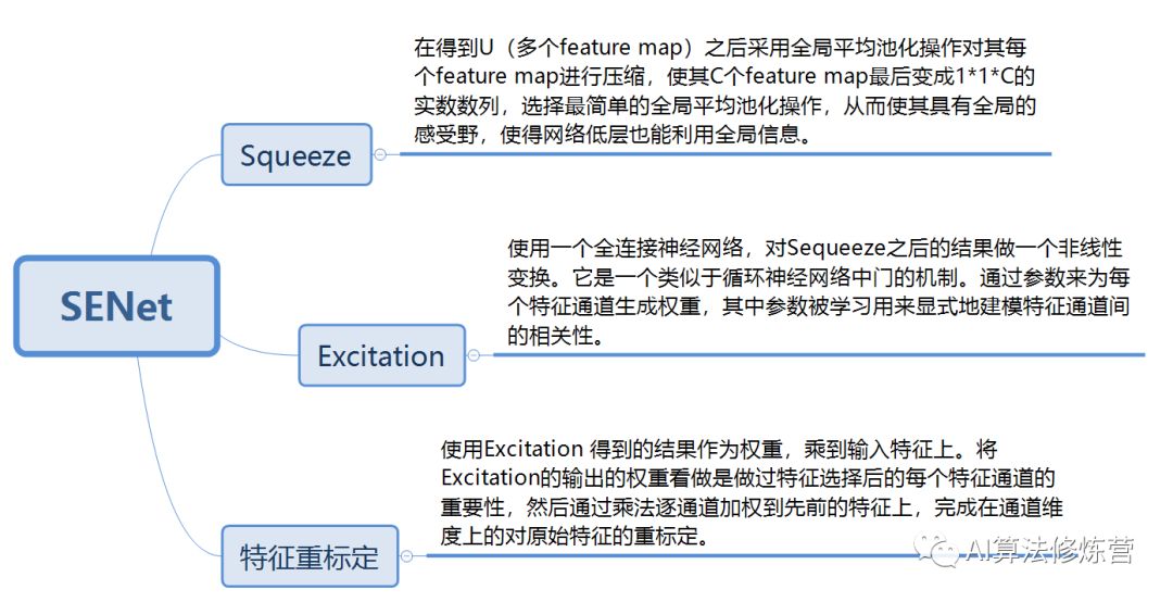 通俗的说就是:通过对卷积的到的feature map进行处理,得到一个和通道数一样的一维向量作为每个通道的评价分数,然后将改分数分别施加到对应的通道上,得到其结果,就在原有的基础上只添加了一个模块。