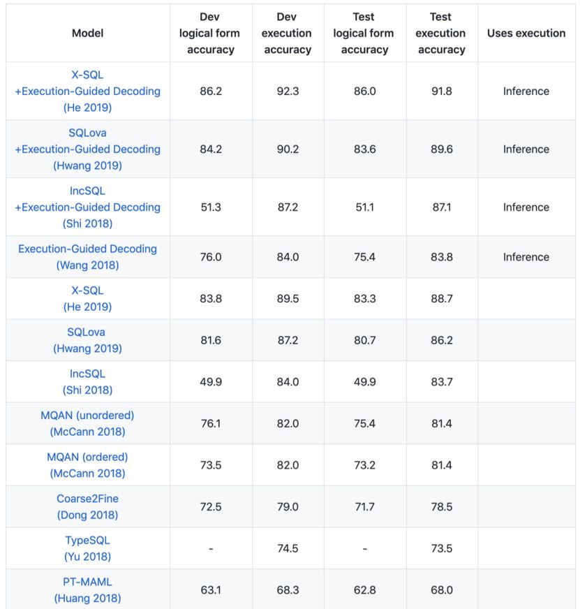 该数据集自提出之后,已经有 18 次公开提交。由于 SQL 的形式较为简单,该数据集不涉及高级用法,Question 所对应的正确表格已经给定,不需要联合多张表格,这些简化使得强监督模型已经可以在 WikiSQL 上达到执行 91.8% 的执行准确率。