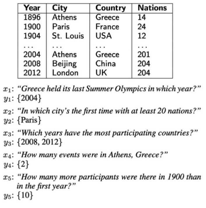 WikiTableQuestions 是斯坦福大学于 2015 年提出的一个针对维基百科中那些半结构化表格问答的数据集,包含了 22,033 条真实问句以及 2,108 张表格。由于数据的来源是维基百科,因此表格中的数据是真实且没有经过归一化的,一个 cell 内可能包含多个实体或含义,比如「Beijing, China」或「200 km」;同时,为了很好地泛化到其它领域的数据,该数据集测试集中的表格主题和实体之间的关系都是在训练集中没有见到过的。下图是该数据集中的一条示例,数据阐述的方式展现出作者想要体现的问答元素。