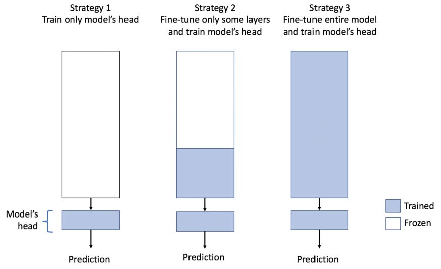 下图说明了使用和微调预训练模型的三种合理方法。在本教程中,我们尝试了第一个和第三个策略。第二个策略在数据集较小,但与预训练模型的数据集不同,或者数据集较大,但与预训练模型的数据集相似的情况下也很常见。