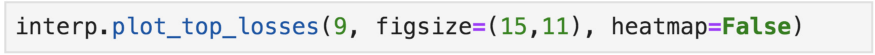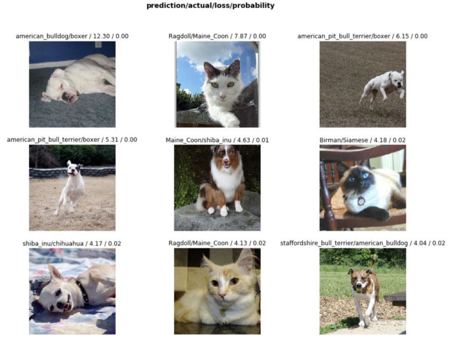 plot_top_losses显示最高损失的图像及其:预测标签/实际标签/损失/实际图像类别的概率