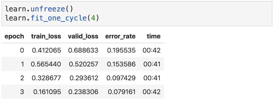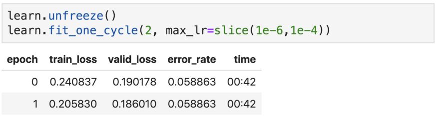 我们总是可以调用unfreeze函数来训练所有网络层,然后再使用fit或fit_one_cycle。这就是所谓的“微调”,这是在调整整个网络的参数。