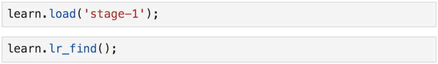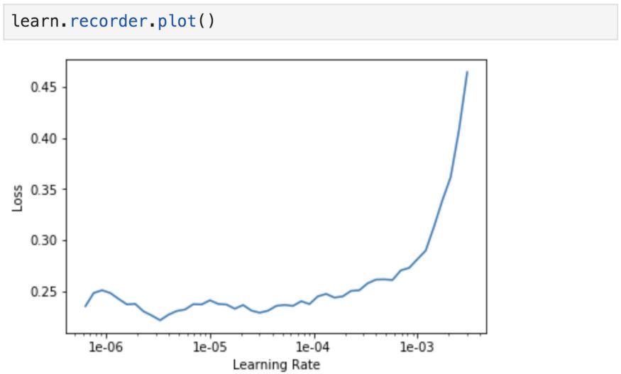 为了找到最适合微调模型的学习率,我们使用学习速率查找器,可以逐渐增大学习速率,并且在每个batch之后记录相应的损失。在fastai库通过lr_find来实现。
