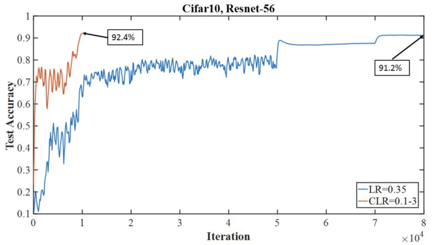 下图显示了超收敛方法如何在Cifar-10的迭代次数更少的情况下达到比典型(分段常数)训练方式更高的精度,两者都使用56层残余网络架构。