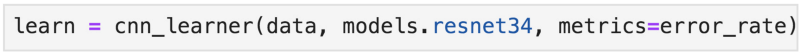cnn_learner 使用来自给定架构的预训练模型构建CNN学习器、来自预训练模型的学习参数用于初始化模型,允许更快的收敛和高精度。我们使用的CNN架构是ResNet34。下图是一个典型的CNN架构。