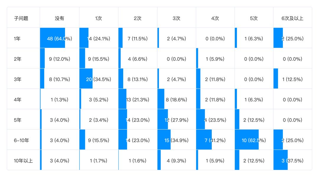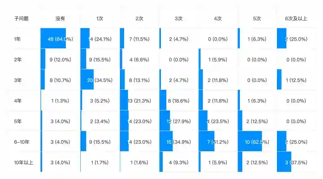 从下图我们可以看到,工作 1-3 年的程序员,跳槽经历比较少。而随着工作年限的增加,跳槽次数也随之增加,这也符合市场规律。工作三年以下的程序员,半数以上都没有过跳槽经历。而工作四年及以上的程序员,没有跳槽经历的人则很少。