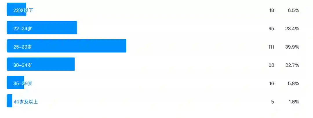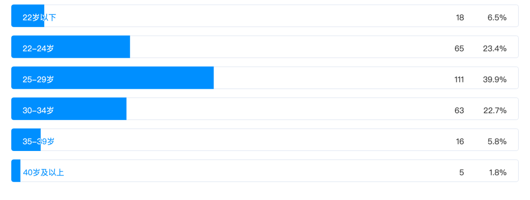 从上图中我们可以看到,22-24 岁的程序员占比高达 23.4%,25-29 岁的程序员占比高达 39.9%,30-34 岁的程序员占比高达 22.7%,这三个年龄段的小伙伴成为了程序员群体的中坚力量。其中年龄在 22-24 岁的程序员,大部分应该是刚刚本科毕业参加工作的同学。而 35 岁及以上的程序员占比仅为 7.6%,也说明程序员队伍里主要是 35 岁以下的人。