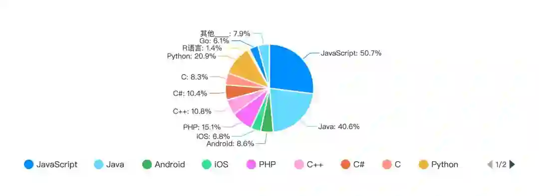 除此之外还有 Android(8.6%)、iOS(6.8%)、PHP(15.1%)、C++(10.8%)、C#(10.4%)、C(8.3%)及其他 7.9%。当然还有后起之秀的 R 语言(1.4%)和 Go 语言(6.1%)。