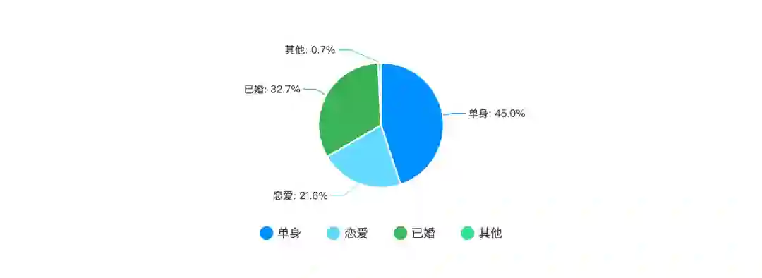 在接受调查的程序员中,单身比例为 45%,这主要与程序员群体较为年轻化有关系,因为本次调查中 30 岁以下的程序员占总体的 69.8%。因此,喜欢程序员小哥哥和小姐姐们的同学,快来程序员群体中找你的另一半吧!程序员聪明、细心、认真且负责,是你的不二之选。