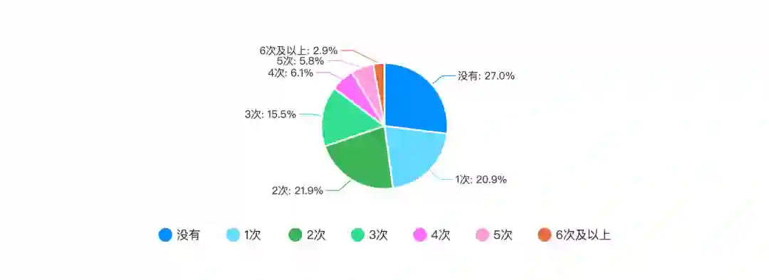 根据统计我们可以看到,没有过跳槽经历的程序员占程序员群体的 27.0%;跳槽 1-3 次的占比过半,为 58.3%;跳槽 4 次的占比为 6.1%;而跳槽 5 次的占比为 5.8%;跳槽 6 次及以上的占比 2.9%。